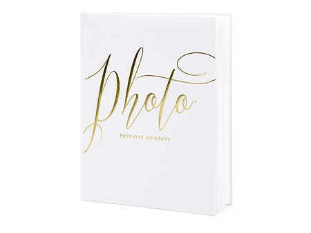 - Album na zdjęcia oprawiony papierem w kolorze białym ze złotym napisem Photo, precious moments, wymiary ok. 20 x 24,5 cm, 22 kartki.