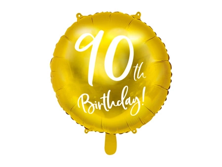 - Okrągły metalizowany balon foliowy w kolorze złotym z białym napisem 90th Birthday, średnica ok. 45 cm (18'').
