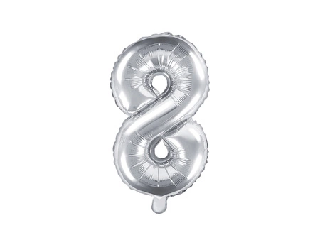 - Balon foliowy metalizowany Cyfra ''8'' w kolorze srebrnym, rozmiar przed napompowaniem ok. 40 cm (16''), rozmiar po napompowaniu ok. 35 cm (14''). Do napomowania powietrzem.