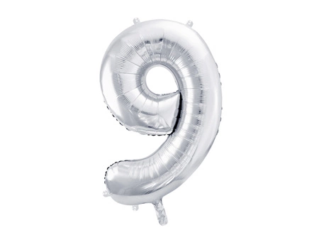 - Balon foliowy metalizowany Cyfra ''9'' w kolorze srebrnym, rozmiar przed napompowaniem ok. 100 cm (39''), rozmiar po napompowaniu ok. 86 cm (34''). Do napomowania powietrzem i helem.