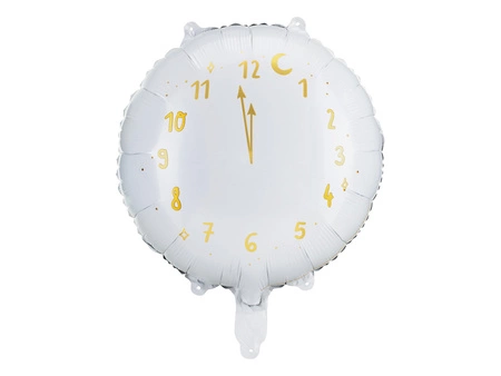 - Balon foliowy Zegar w kolorze białym ze złotym nadrukiem, wymiary przed napompowaniem ok. 45 cm (18''), wymiary po napompowaniu ok. 35 cm (14 ''). Do napompowania powietrzem i helem. Zestaw zawiera słomkę.