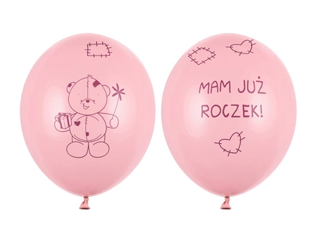 - Balony Strong Miś - mam już roczek w kolorze Pastel Pink, z czerwonym, trzystronnym nadrukiem: z obu stron oraz z góry, średnica 30 centymetrów. (1 op. / 50 szt.)