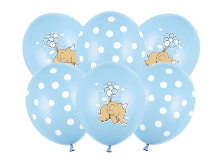 - Balony Strong Słonik, Pastel Baby Blue Mix, w skład zestawu wchodzą balony z dwustronnym nadrukiem Słonik, oraz z białym, pięciostronnym nadrukiem Kropki. (1 op. / 6 szt.)