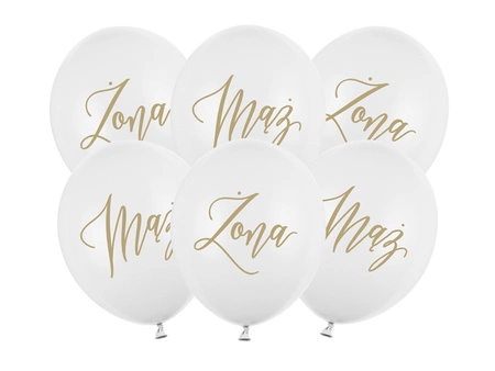 - Balony Strong, Pastel Pure White ze złotym dwustronnym nadrukiem: Żona (3 szt.) i Mąż (3 szt.), średnica 30 cm. (1 op. / 6 szt.)