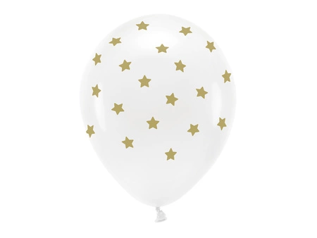 - Balony Eco Gwiazdki, pastelowe w kolorze białym z pięciostronnym nadrukiem w kolorze złotym, średnica ok. 33 cm. (1 op. / 6 szt.)
