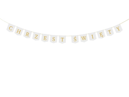 - Baner ''Chrzest Święty'' wykonany z papieru w kolorze białym ze złotym napisem oraz sznurek w kolorze złotym o długości ok. 2.5 m. Produkt do samodzielnego złożenia.