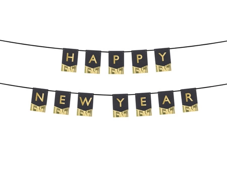 - Baner Happy New Year, wykonany z czarnego papieru ze złotą folią oraz złotym napisem, wymiary ok. 135 x 16,5 cm, długość wstążki ok. 3,5 m.