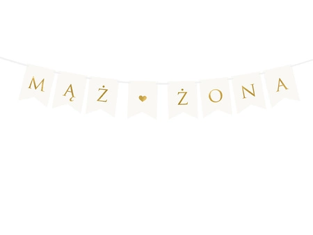 - Baner w kolorze białym ze złotym napisem Mąż Żona, do samodzielnego złożenia, zestaw zawiera literki i ok. 2,5 m białej tasiemki, wymiary po złożeniu: wysokość ok. 15 cm, długość ok. 110 cm.