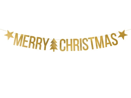 - Baner Merry Christmas w kolorze złotym lustrzanym, do samodzielnego złożenia, zestaw zawiera literki oraz ok. 2 m złotego sznurka, wymiary po złożeniu: wysokość ok. 10,5 cm, długość ok. 150 cm.