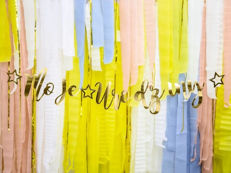 - Baner przeszywany Moje urodziny, wykonany z papieru lustrzanego w kolorze złotym, wymiary: wysokość ok 16,5 cm, długość ok. 90 cm.
