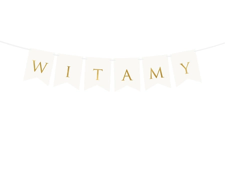 - Baner w kolorze białym ze złotym napisem Witamy, do samodzielnego złożenia, zestaw zawiera literki i ok. 2,5 m białej tasiemki, wymiary po złożeniu: wysokość ok. 15 cm, długość ok. 80 cm.