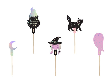 - Dekoracje do muffinek Halloween, zestaw zawiera 5 wzorów, mix kolorów, wysokość ok. 14 cm. Produkt do samodzielnego złożenia. (1 op. / 6 szt.)