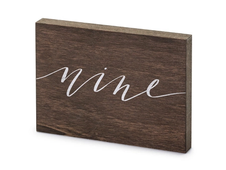 - Drewniany numer na stół z białym napisem "Nine"