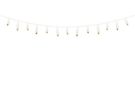 - Girlanda przeszywana Piórka w kolorze białym ze złotymi metalizowanymi końcówkami, wymiary: wysokość ok. 13,5 cm, długość ok. 1,6 m.