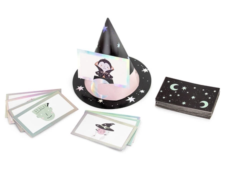 W zestawie znajdują się charakterystyczne czarne czapki czarownic, które nie tylko podkreślają klimat Halloween, ale również stanowią praktyczny element gry. Każda czapka wyposażona jest w gumkę, dzięki czemu łatwo dopasować ją do głowy zarówno dziecka, jak i dorosłego. Czapki mogą być także wykorzystane jako element przebrania podczas balu przebierańców, zabaw szkolnych czy domowych seansów filmowych z motywem czarownic. Po zakończonej grze mogą stać się oryginalną dekoracją stołu lub pokoju.