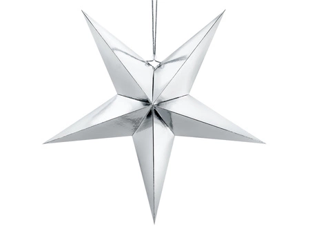 - Gwiazda papierowa pięcioramienna wykonana ze srebrnego lustrzanego papieru, ze srebrnym sznurkiem, średnica ok. 70 cm. Produkt do samodzielnego złożenia.