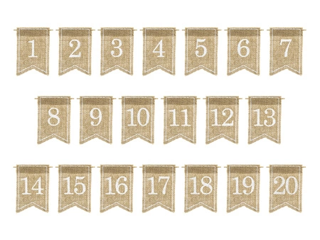 - Numery na stół wykonane z juty z białym nadrukiem, zestaw zawiera numery od 1 do 20 na sznurku, wymiary: szerokość ok. 7 cm, wysokość ok. 10,5 cm, długość całkowita ok. 37 cm. (1 op. / 20 szt.)
