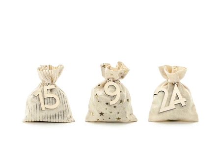 Każdy z woreczków możesz oznaczyć jednym z 24 drewnianych numerków, które są częścią zestawu. Drewniane elementy nadają całości naturalny, skandynawski charakter i doskonale komponują się z bawełnianymi woreczkami. W zestawie znajduje się także 24 bawełniane sznurki o długości około 30 cm każdy, umożliwiające wygodne zawieszenie woreczków na gałęzi, kominku, ścianie lub sznurku rozwieszonym w pokoju. Dzięki temu możesz dowolnie aranżować kalendarz w swoim domu – zarówno w salonie, pokoju dziecięcym, jak i w kuchni.