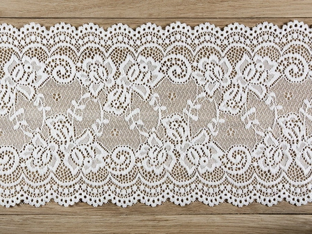 - Koronka w kolorze złamanej bieli, szerokość ok. 15 cm, długość ok. 9 m. (1 szt. / 9 mb.)