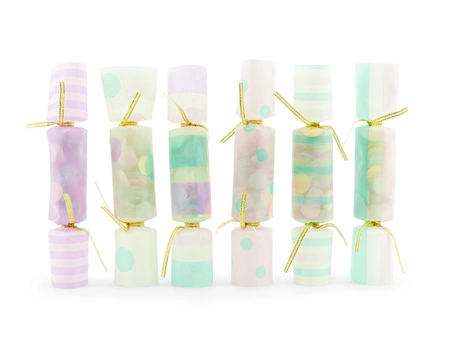 - Krakersy z konfetti, mix kolorów, każdy krakers zawiera ok 1,5 g konfetti, wymiary ok. 3 x 17 x 3,5 cm. (1 op. / 6 szt.)