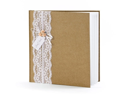 - Księga Gości oprawiona naturalnym papierem w kolorze brązowym, z koronką i jasnoróżowymi różyczkami oraz napisem Guest Book. Kolekcja Vintage, wymiary 20,5x20,5 centymetra, 22 kartki.