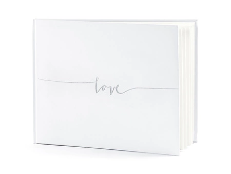 - Księga Gości oprawiona papierem w kolorze białym, ze srebrnym napisem Love, wymiary ok. 24 x 18,5 cm, 22 kartki, bez tekstu.
