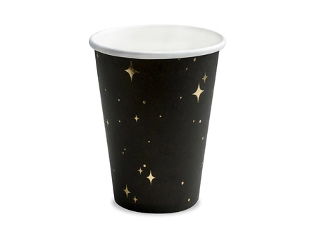 - Kubeczki papierowe w kolorze czarnym ze złotym wzorem, pojemność ok. 260 ml. Kubki na napoje zawierają oznaczenia wymagane przez Rozporządzenie wykonawcze Komisji (UE) 2020/2151 z dnia 17 grudnia 2020 r. ustanawiające zasady dotyczące zharmonizowanych spe