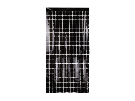 Kurtyna Party Kwadraty metalizowana w kolorze czarnym, szerokość ok. 100 cm, wysokość ok. 200 cm.