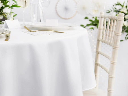 - Obrus na stół z matowego w kolorze białym, okrągły, średnica 280 centymetrów.