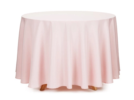 - Obrus na stół z matowego materiału w kolorze brudnego różu, okrągły, średnica 230 centymetrów.