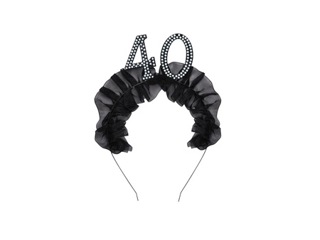- Opaska z czarną, materiałową falbanką oraz liczbą 40 udekorowaną perełkami. Rozmiar całościowy ok 12 x 19,5 cm. Wysokość samej liczby ok. 5,3 cm