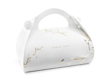 - Ozdobne pudełka na ciasto, wykonane z białego papier ze złotym metalizowanym wzorem gałązek. Wymiary po złożeniu ok. 16 x 8,5 x 9,5 cm. (1 op. / 10 szt.)