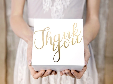 Ozdobne pudełka z napisem „Thank you” w złotym kolorze są doskonałym wyborem nie tylko na wesela, ale także na chrzest, komunię, baby shower czy firmowe eventy. Ich elegancki wygląd sprawia, że pasują do różnorodnych dekoracji stołu, a uniwersalny rozmiar pozwala na kreatywne wykorzystanie – można w nich zapakować także małe prezenty, ciasteczka, praliny czy drobne upominki dla gości. To praktyczne rozwiązanie, które podkreśla troskę o detale i dbałość o gości.