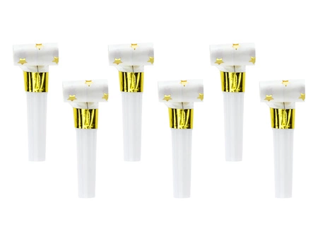 Papierowe gwizdki imprezowe – biały kolor i złoty wzór gwiazd