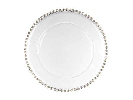 Transparentny podtalerz z ozdobnymi perłami to wyjątkowy dodatek do każdego stołu. Dzięki przezroczystej powierzchni zyskuje niezwykłą uniwersalność – pasuje zarówno do klasycznej, jak i nowoczesnej zastawy stołowej. Perłowe akcenty dodają elegancji, sprawiając, że każde nakrycie prezentuje się wyjątkowo stylowo. Doskonale sprawdzi się podczas rodzinnych obiadów, świątecznych spotkań czy eleganckich kolacji. Transparentny kolor podkreśli barwy serwowanych potraw, a delikatne perły będą subtelną ozdobą stołu.