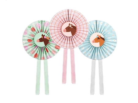 - Rozety dekoracyjne Konie wykonane z papieru, z wstążką, mix kolorów, średnice po złożeniu ok. 35 cm (1 op. / 3 szt.)