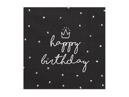 - Serwetki trójwarstwowe Happy Birthday w kolorze czarnym z białym nadrukiem, wymiary 33 x 33 cm. (1 op. / 20 szt.)
