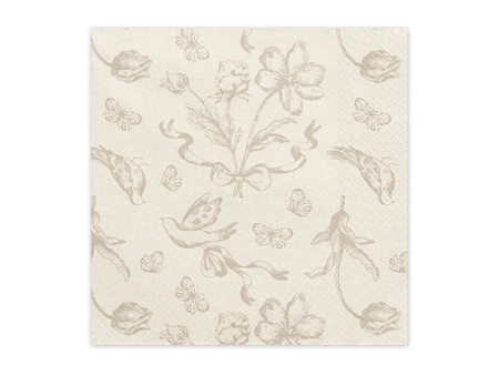- Papierowe serwetki w kolorze beżowym z ciemnobeżowymi kwiatami. Wymiary po rozłożeniu ok. 33 x 33 cm, wymiary po złożeniu ok. 16.5 x 16.5 cm. (1 op. / 12 szt.)