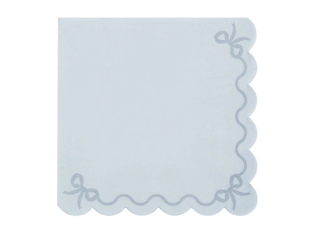 - Serwetki papierowe w kolorze mglistym niebieskim zakończone falbanką. Na serwetkach nadruk wstążki z kokardką. Wymiary po rozłożeniu ok. 33 x 33 cm, wymiary po złożeniu ok. 16,5 x 16,5 cm. (1 op. / 12 szt.)