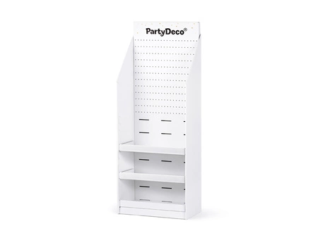 - Stand papierowy w kolorze białym, wymiary po złożeniu: szerokość 58 cm, wysokość 160 cm, głębokość 40 cm. Zestaw nie zawiera haków. Produkt do samodzielnego złożenia przez klienta.