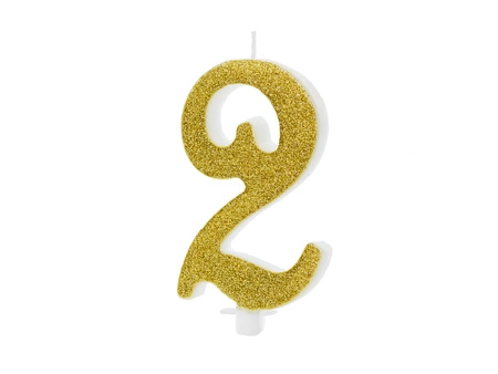 - Świeczka urodzinowa Cyferka 2 w kolorze złotym brokatowym, rozmiar ok. 10cm.