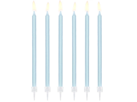 - Świeczki urodzinowe gładkie w kolorze jasnoniebieskim, wysokość ok. 14 cm. Zestaw zawiera 12 świeczek i podstawek. (1 op. / 12 szt.)