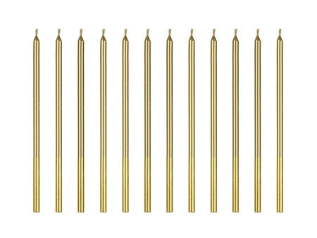 - Świeczki urodzinowe gładkie w kolorze złotym, wysokość ok. 14 cm. Zestaw zawiera 12 świeczek. (1 op. / 12 szt.)