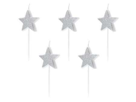 - Świeczki urodzinowe Gwiazdki w kolorze srebrnym brokatowym, wysokość ok. 3.5 cm. (1 op. / 5 szt.)