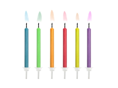- Świeczki urodzinowe Kolorowe Płomienie, mix 6 kolorów, po odpaleniu palą się kolorowymi płomieniami, rozmiar ok. 6 cm, w zestawie 6 świeczek i 6 podstawek. (1 op. / 6 szt.)