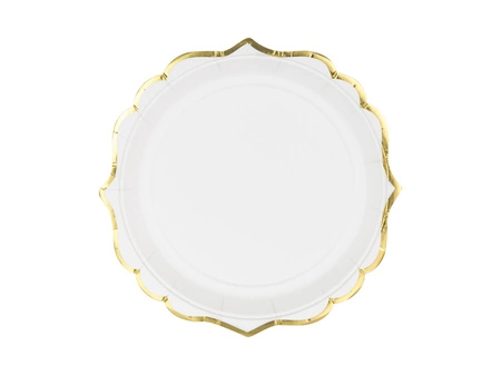 - Talerzyki papierowe w kolorze białym ze złotymi brzegami, średnica ok. 18,5 cm. (1 op. / 6 szt.)