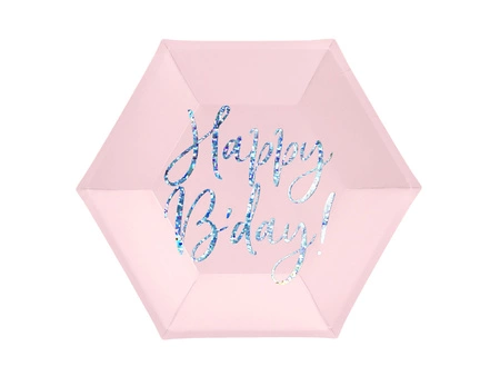 - Talerzyki papierowe w kolorze jasnego pudrowego różu z opalizującym napisem Happy B'day!, średnica ok. 20 cm. (1 op. / 6 szt.)