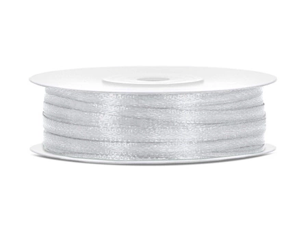 - Tasiemka satynowa w kolorze srebrnym, szerokość 3 milimetry, długość 50 metrów.