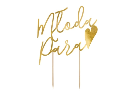 - Topper na tort Młoda Para, wykonany z papieru lustrzanego w kolorze złotym, wysokość ok. 22,5 cm.