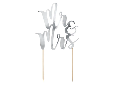 - Topper na tort Mr&Mrs, wykonany z papieru lustrzanego w kolorze srebrnym, wysokość ok. 25,5 cm.